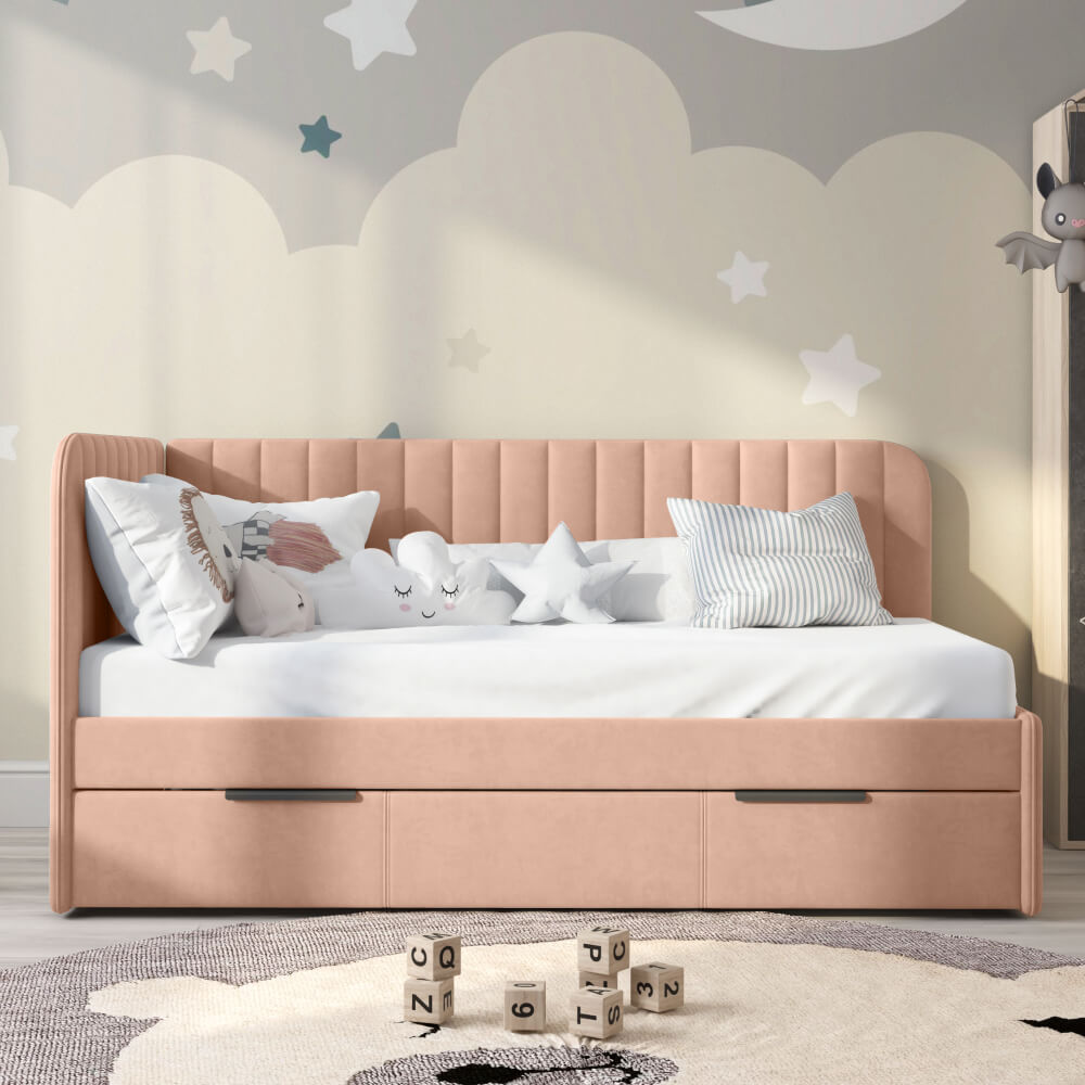 Детская кровать ELLA с вертикальной строчкой и выдвижным ящиком сочетает в себе функциональность, стиль, удобство и комфорт, делая ее отличным выбором для детской комнаты.