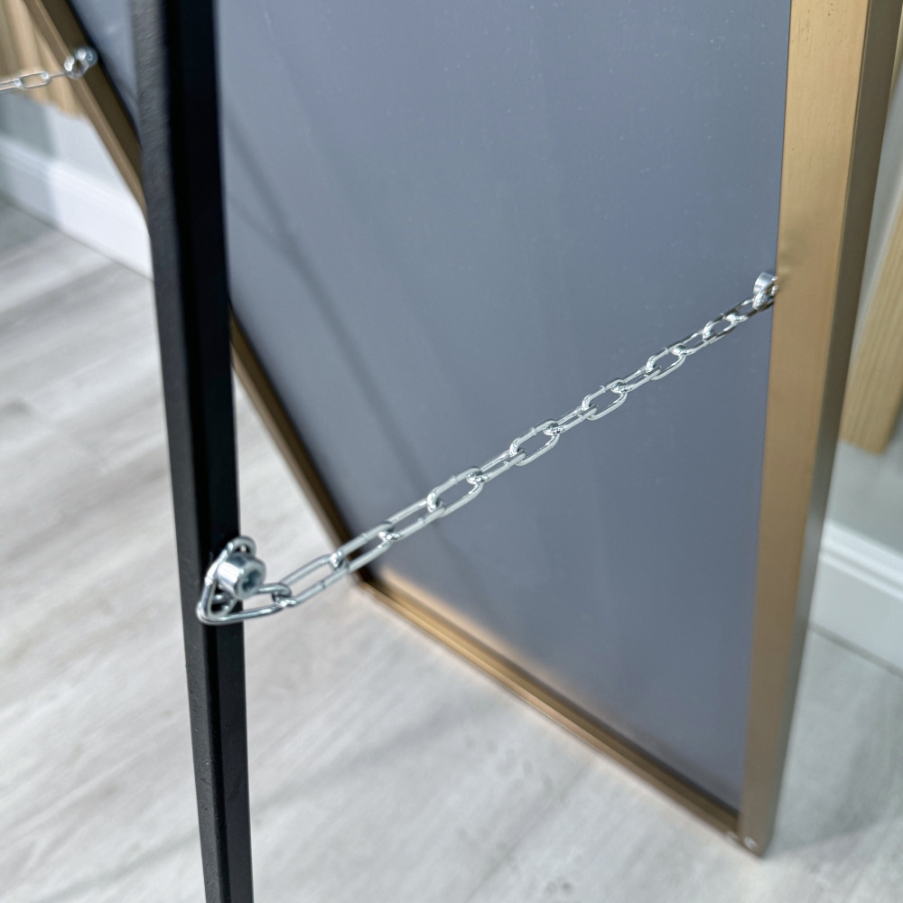 На зеркале установлена откидная ножка с надежным фиксатором в виде цепочки. Конструкция обеспечивает устойчивое положение и предотвращает его случайное опрокидывание, что делает зеркало безопасным в использовании.